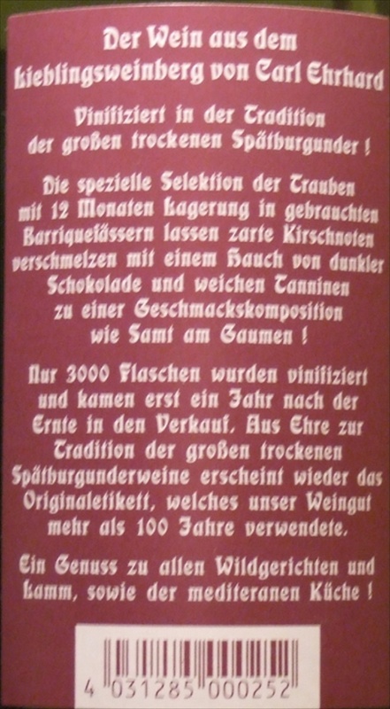 Erstmalig wieder im ganz traditionellen Gewand ist dieser Jahrgang sonst wie die vorigen, nur deutlich teurer, weil Ehrhard wie auch andere massive Einbrüche bei der Ernte 2010 hinnehmen musste. Rot & Weiß, bei 12 Euro.