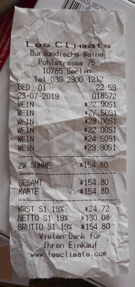 Braasch ist natürlich nur der Vertrieb, der Hersteller ist nicht angegeben, nur das Gebiet, Mosel. Ein relativ trockener Rivaner, aber ein klein bisschen Restsüße hat er noch. Sehr frisch, deutlich perlig, und auch wenn er ohne Jahresangabe kommt, bin ich mir doch sicher, das ist ein 2018er. Nicht übel, frisch, ganz attraktiv, mäßig ausdrucksstark, aber das ist völlig in Ordnung für so eine Literware. Als solche ist er dann allerdings nicht billig – aber man bedenke, das ist die Top-Touri-vorbeilauf-Adresse, und es ist in Flensburg, da ist die Konkurrenz nicht riesig. Der Kollege Tiller ist nicht weit, aber eben gerade 30 m außerhalb der Touristenströme. Bei uns wäre so eine Qualität vermutlich eher näher an 4 Euro für 0,75 l als über 5. Flensburg, Braasch, 6,95 €/l.